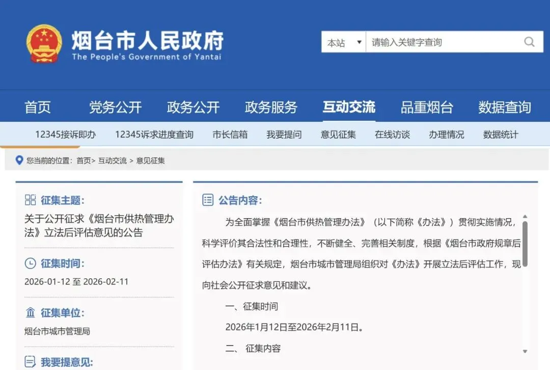 目前烟台市政府管网正在进行公开意见征集:烟台市城市管理局于2026年1月12日至2月11日就办法的立法后评估公开征求意见,您可围绕供暖质量、退费、老旧小区等问题提出建议。