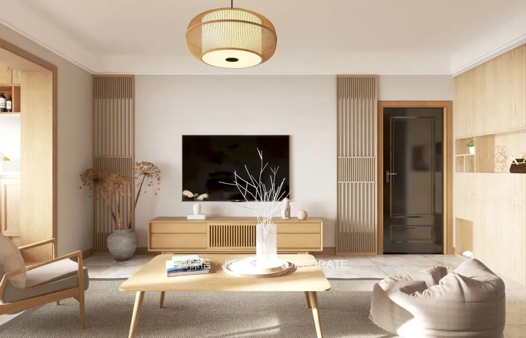 客厅以温暖的原木色为主调,营造出清新雅致的居家氛围。电视墙两侧装饰着木质格栅,线条简洁素净。家具多选用原木材质,自然而轻盈,透出日式美学的简约韵味。竹编吊灯洒下柔光,与编织地毯、干枝摆件相呼应,更添几分自然意趣。