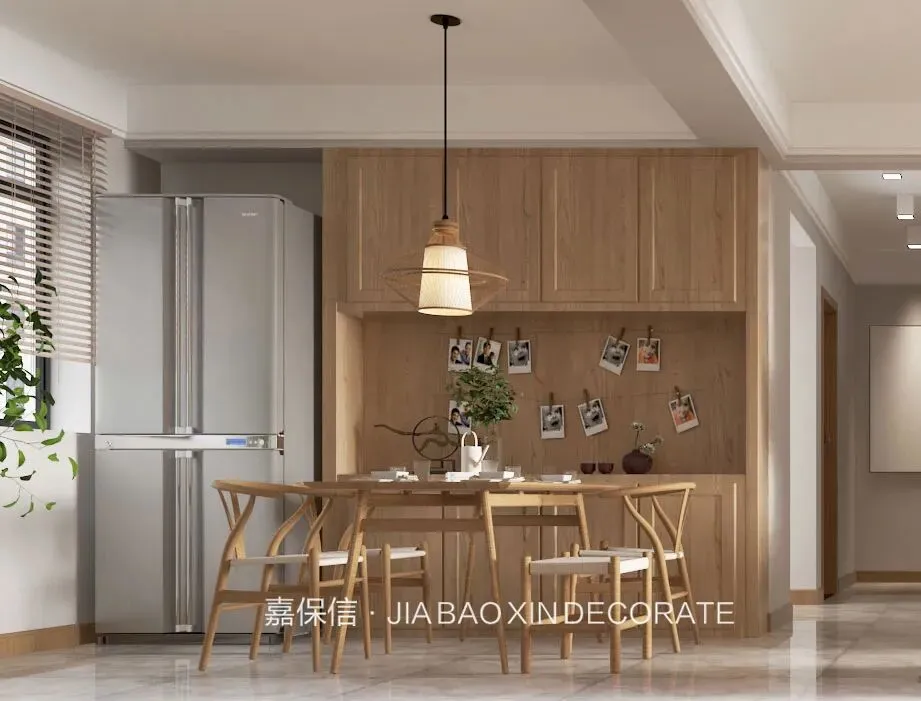餐厅延续着温暖的原木色调,营造出宁静而舒适的氛围。餐边柜与桌椅皆以原木打造,线条利落,形态轻盈,勾勒出日式家居的极简轮廓。一盏竹编吊灯悬于餐桌上方,洒下柔和光线,为每一餐时光增添了氛围感。家人围坐,灯光温柔,在简单日常中,悄然映照出属于家的温情与诗意。