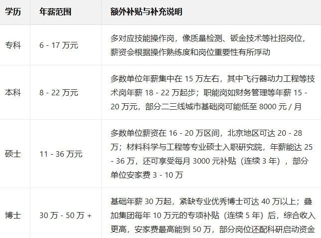 职能管理岗:整体薪资低于核心研发岗,像财务、保密管理、党建宣传等岗位,本科年薪 15 - 20 万元;北京地区的财务管理岗社招(5 - 10 年经验)月薪 12 - 15K,还配有餐补、保密补等福利,对学历和专业的包容度较高。