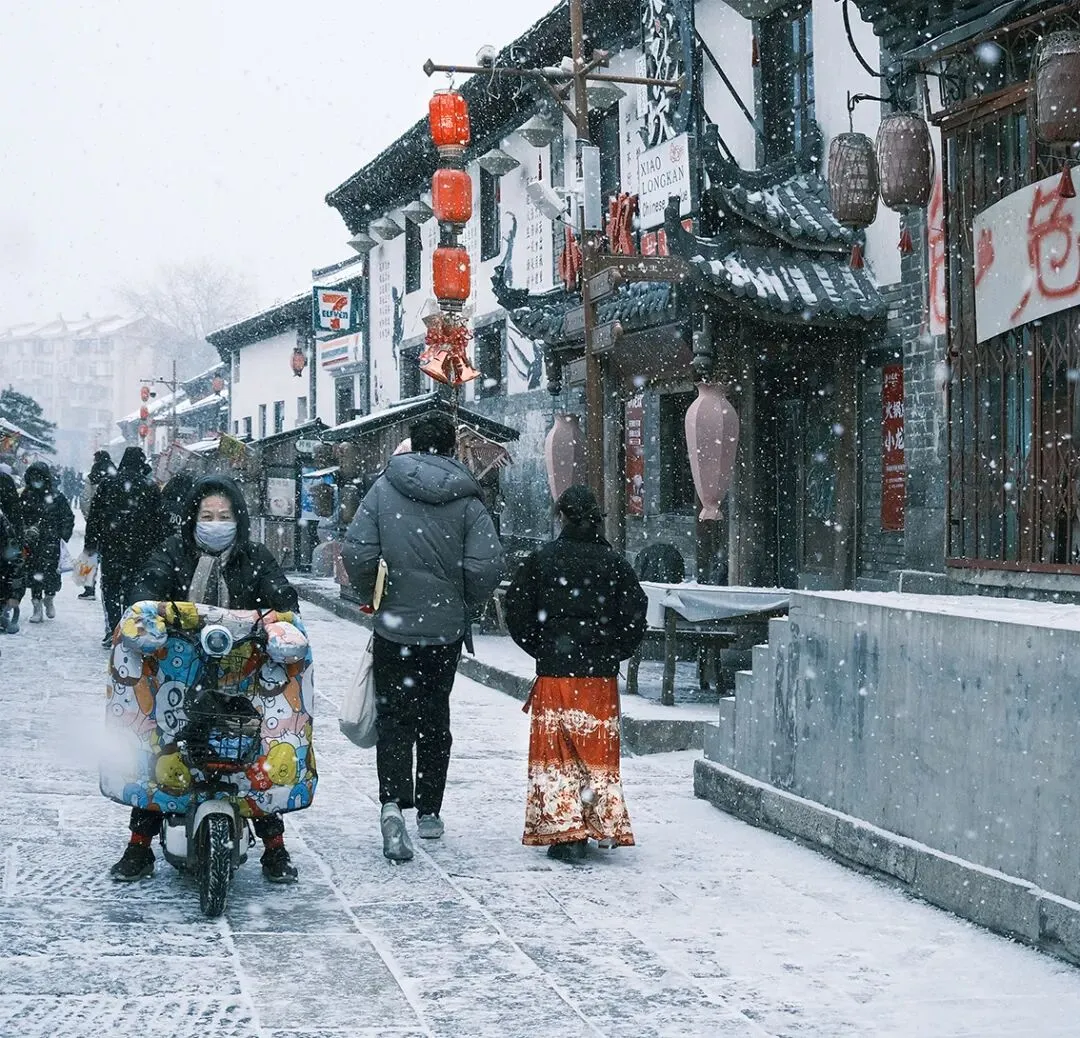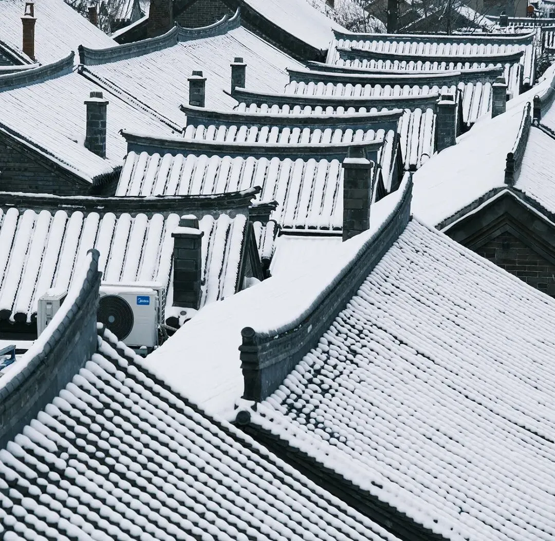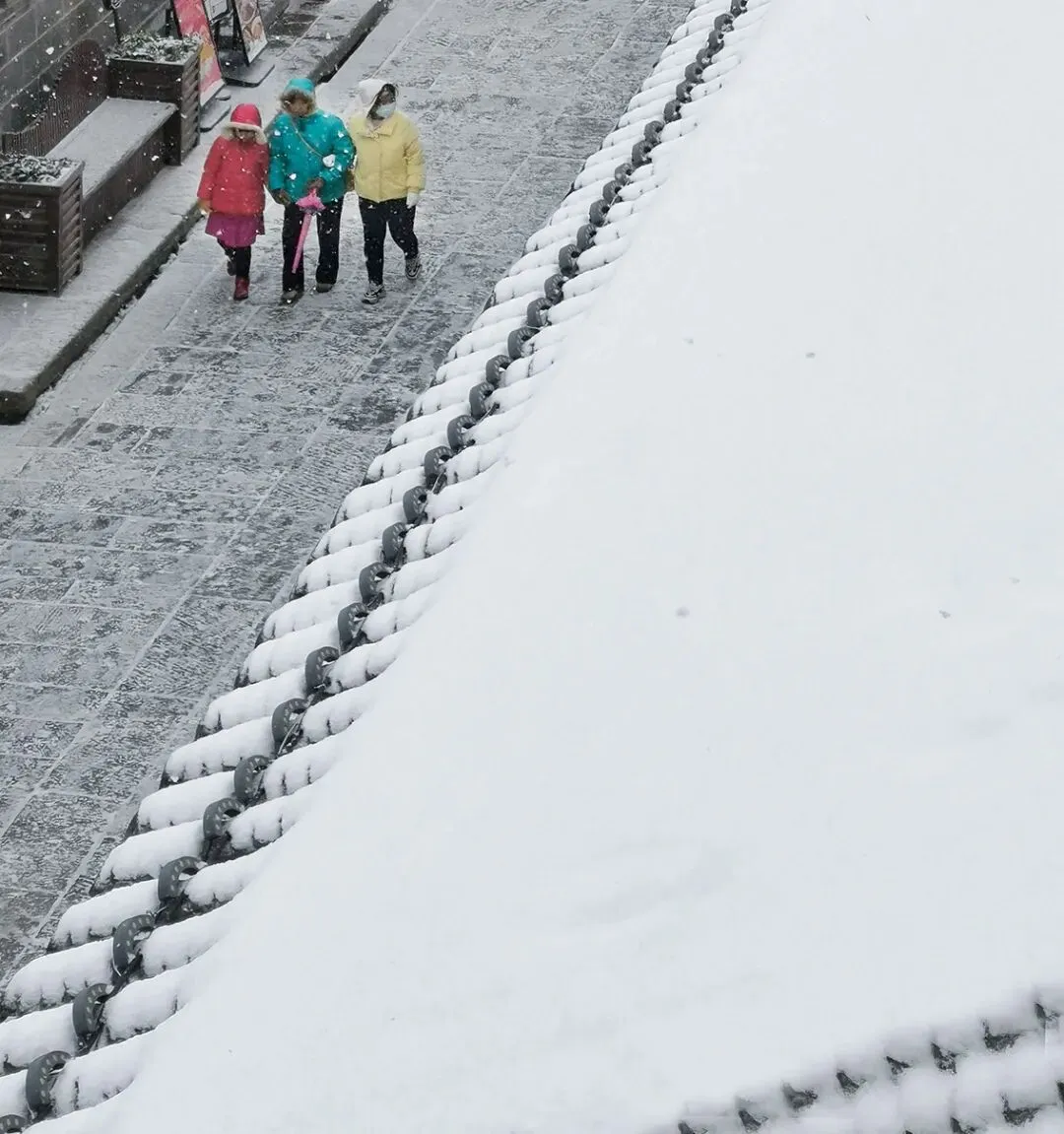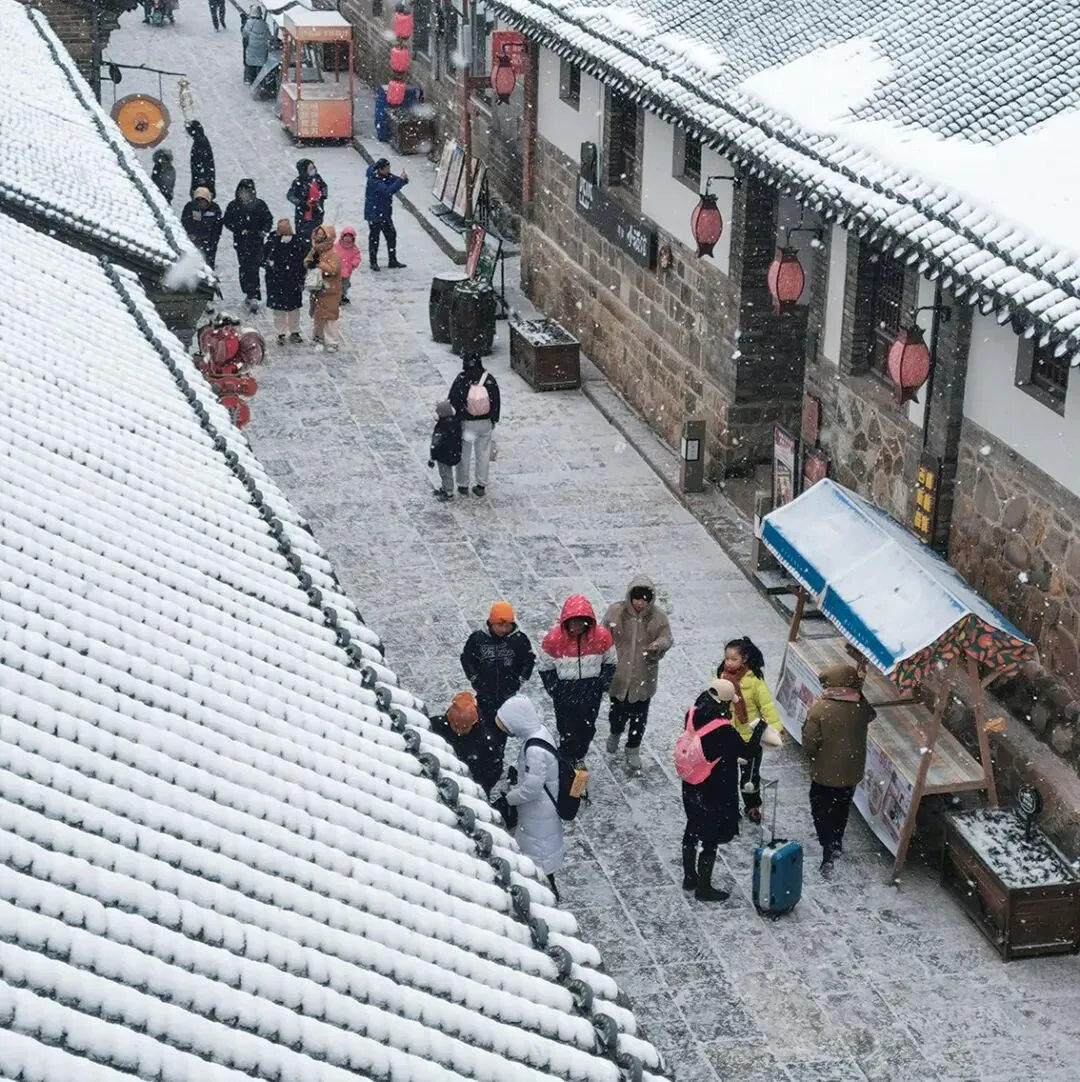 当落雪洒满街道,覆盖青瓦,古城便披上银装。鳞次栉比的屋檐翘脚,在素白中勾勒出浅淡的墨线,把古城润染成一幅水墨画卷。