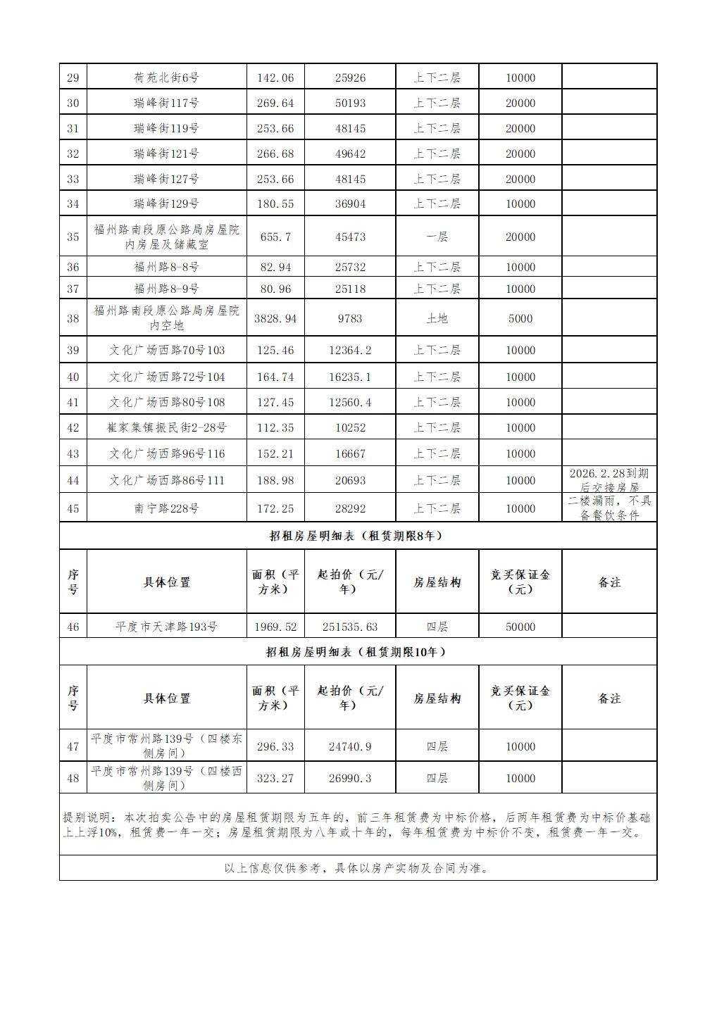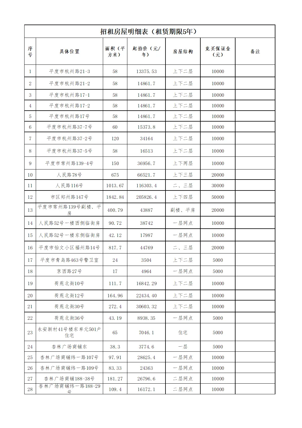 一、拍卖标的:平度市杭州路、人民路、郑州路、常州路、青岛路、京西路、荷苑北街、怡文小区、杏林广场、瑞峰街、福州路南段、文化广场西路、崔家集镇振民街、南宁路等48处房屋租赁权,标的清单详见、中拍平台。