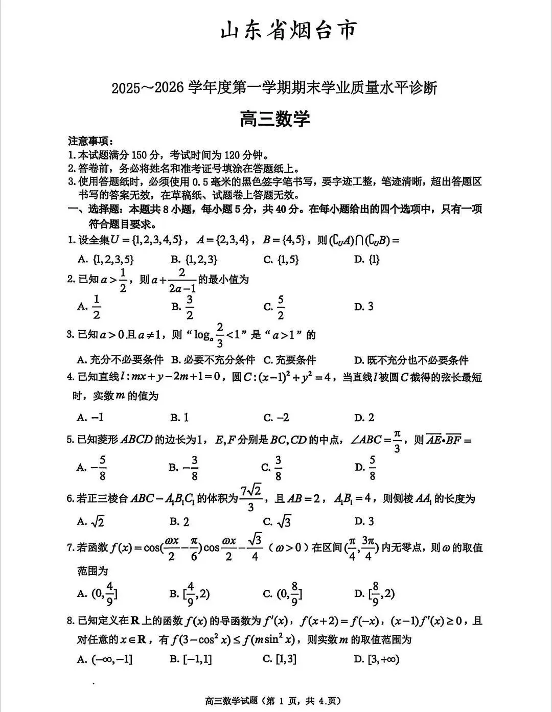 >分享山东烟台市2025—2026学年度第一学期期末学业质量水平诊断高三数学试题