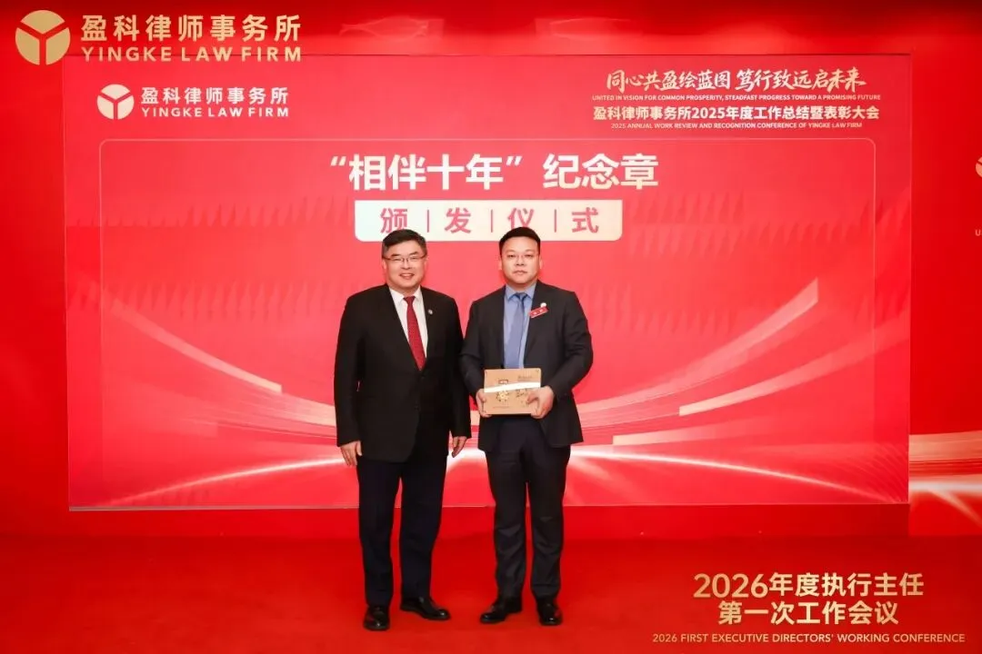盈科烟台党支部书记、执行主任李君和股权高级合伙人刘国平荣获盈科律师事务所“相伴十年”纪念章。