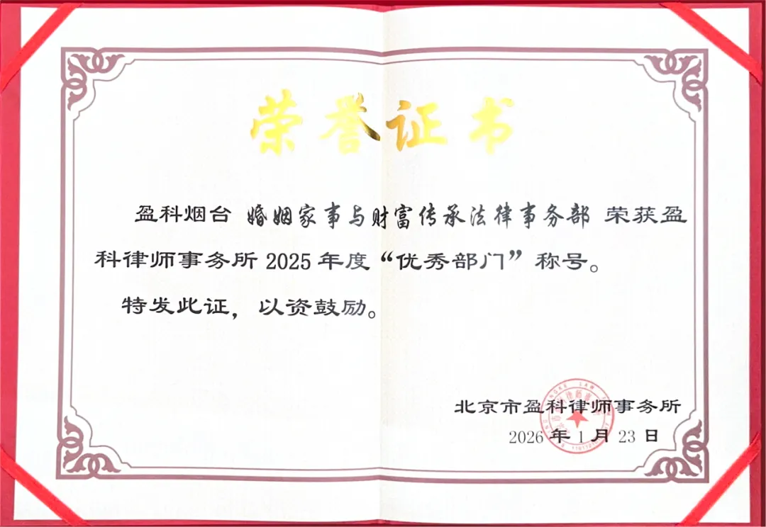 赵海霞带领的盈科烟台婚姻家事与财富传承法律事务部荣获盈科律师事务所2025年度“优秀部门”称号。