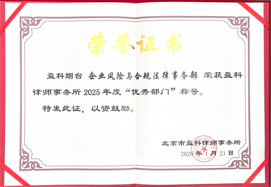 李成斌带领的盈科烟台企业风险与合规法律事务部荣获盈科律师事务所2025年度“优秀部门”称号。