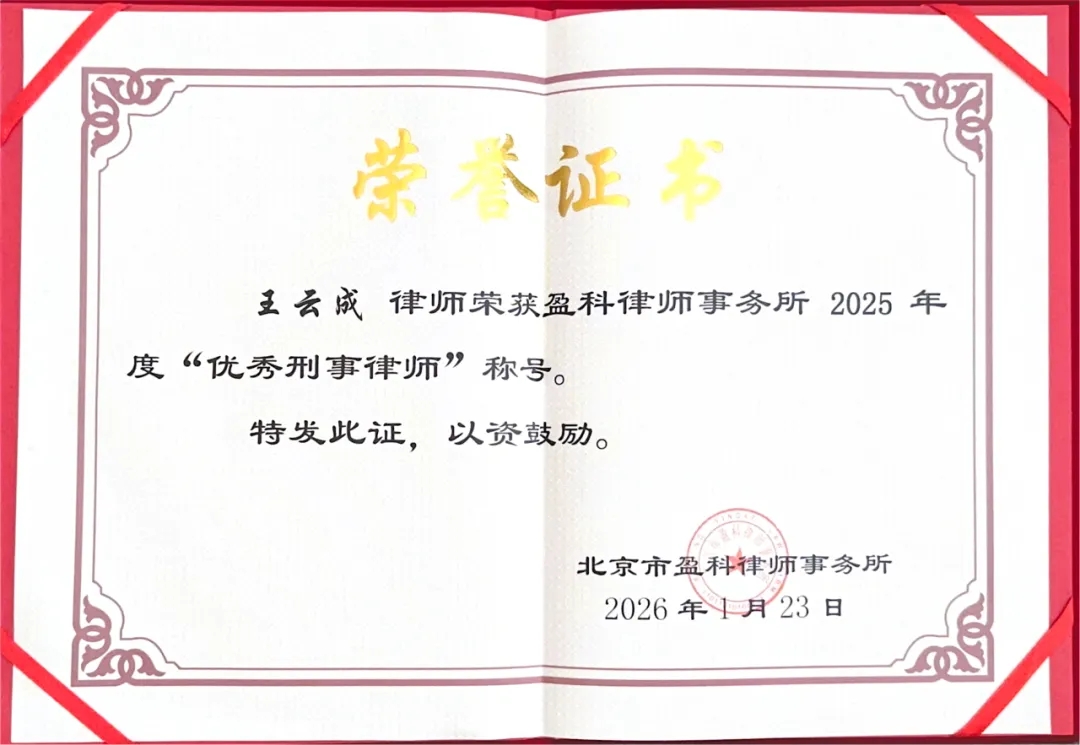 王云成荣获盈科律师事务所2025年度“优秀刑事律师”称号。