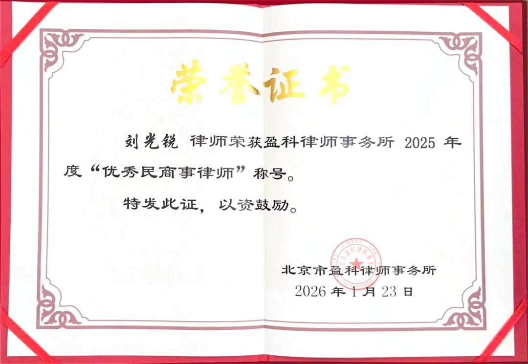 刘光锐荣获盈科律师事务所2025年度“优秀民商事律师”称号。