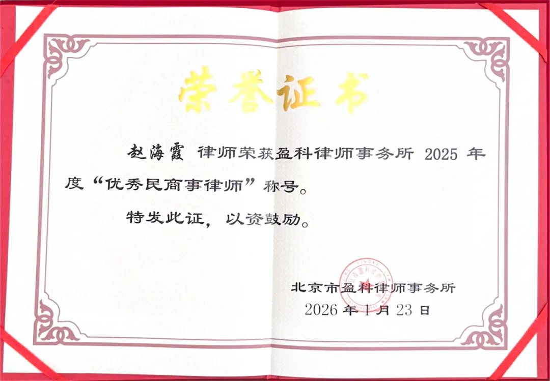 赵海霞荣获盈科律师事务所2025年度“优秀民商事律师”称号。