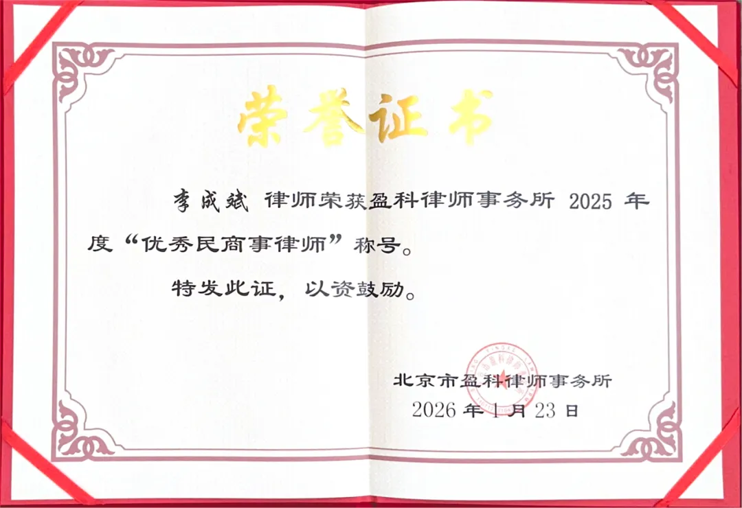 李成斌荣获盈科律师事务所2025年度“优秀民商事律师”称号。