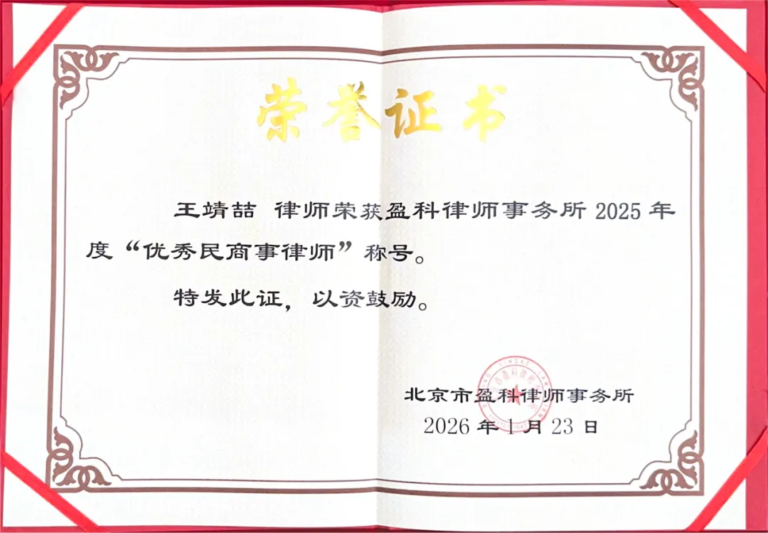 王靖喆荣获盈科律师事务所2025年度“优秀民商事律师”称号。