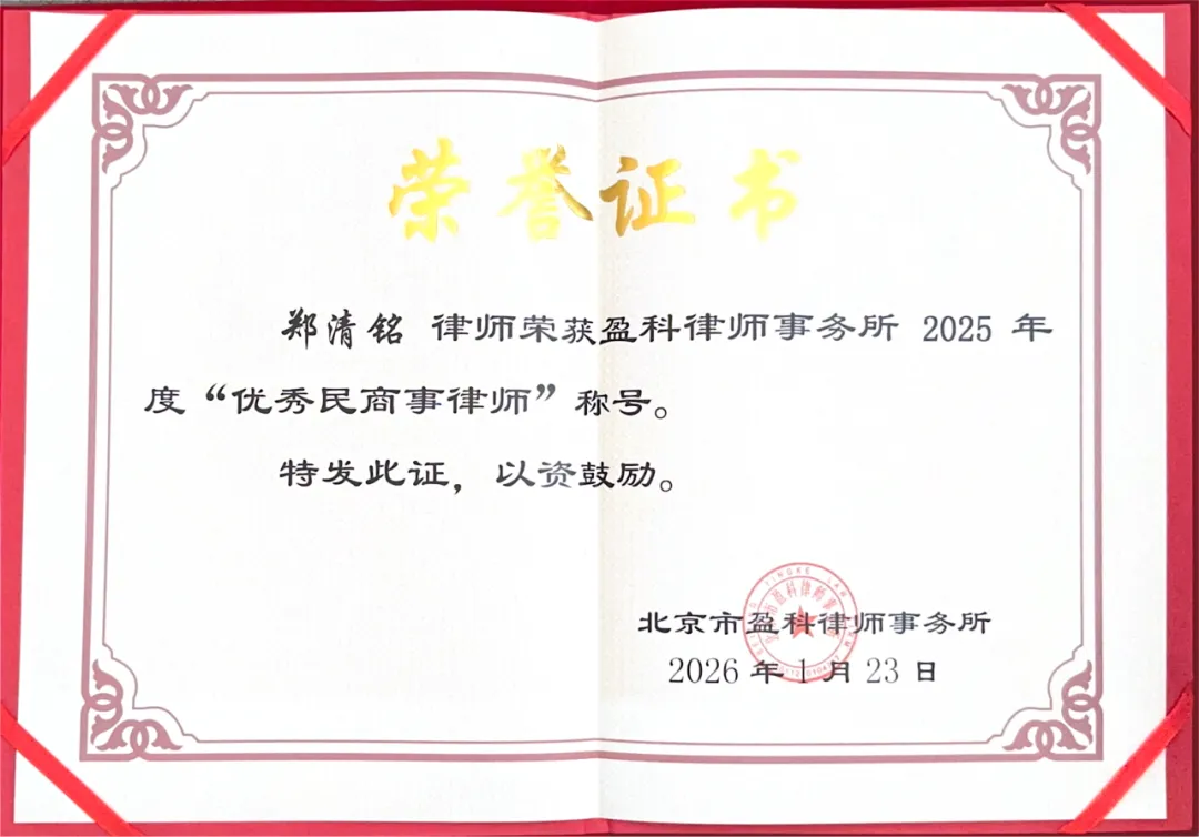 郑清铭荣获盈科律师事务所2025年度“优秀民商事律师”称号。