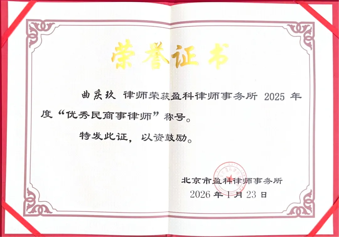 曲庆玖荣获盈科律师事务所2025年度“优秀民商事律师”称号。
