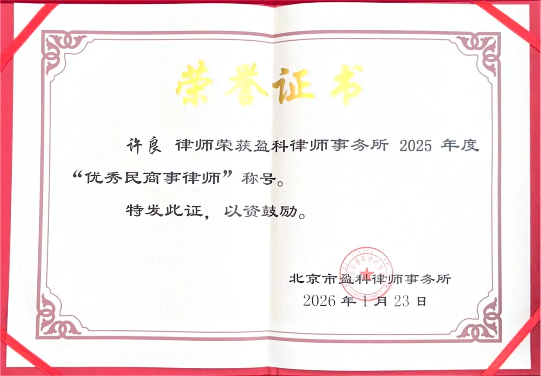 许良荣获盈科律师事务所2025年度“优秀民商事律师”称号。