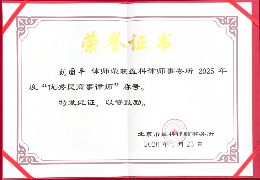 刘国平荣获盈科律师事务所2025年度“优秀民商事律师”称号。