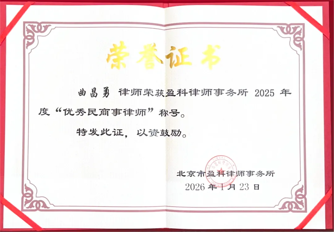 曲昌勇荣获盈科律师事务所2025年度“优秀民商事律师”称号。
