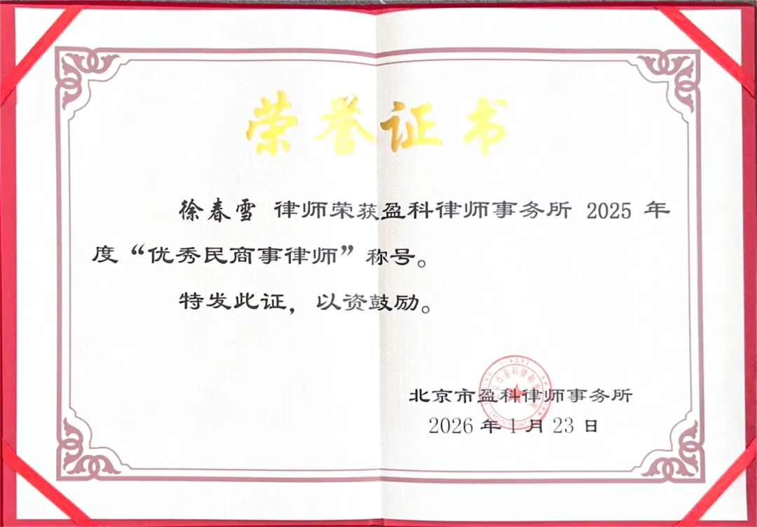 徐春雪荣获盈科律师事务所2025年度“优秀民商事律师”称号。