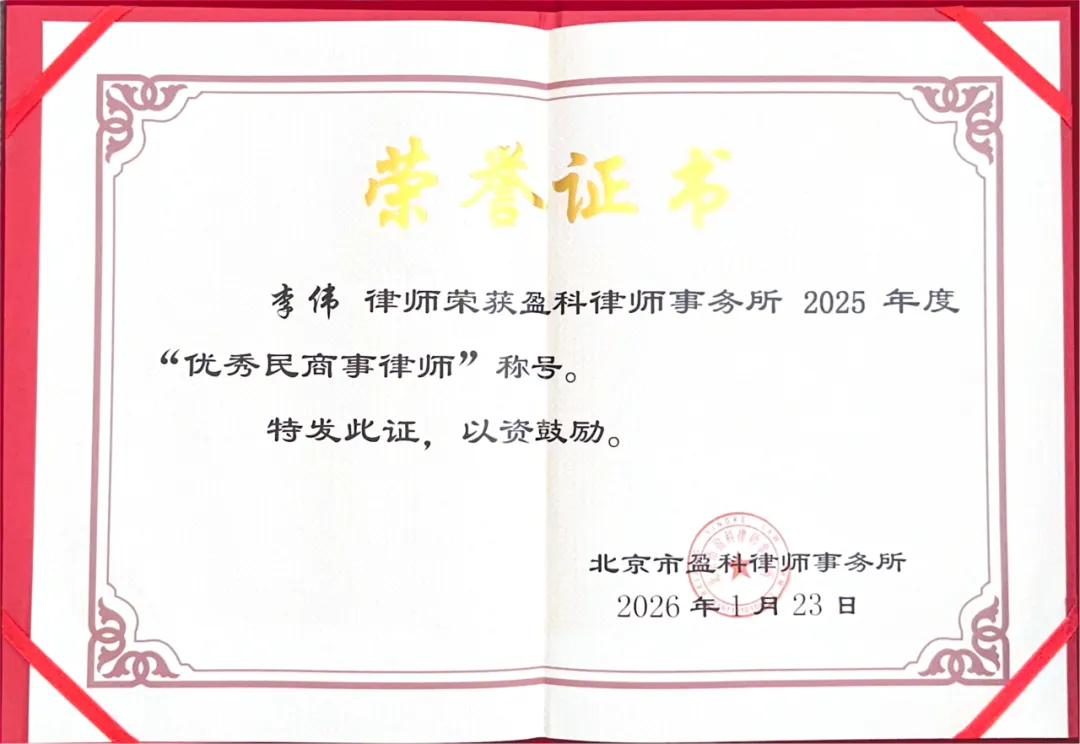 李伟荣获盈科律师事务所2025年度“优秀民商事律师”称号。