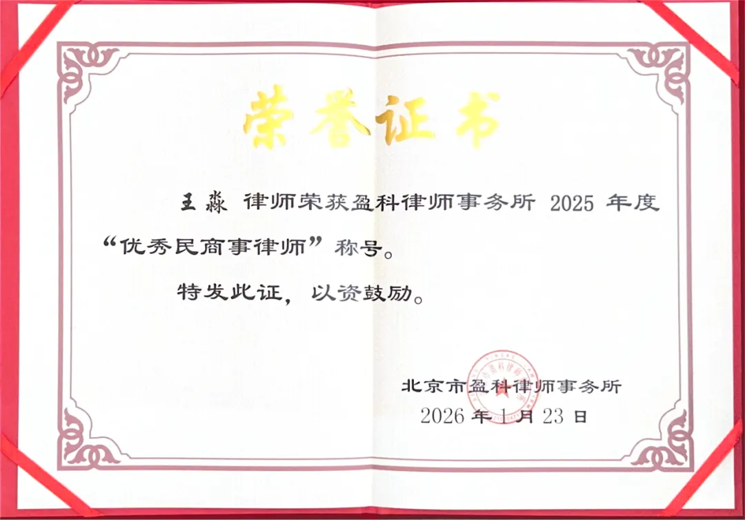 王淼荣获盈科律师事务所2025年度“优秀民商事律师”称号。