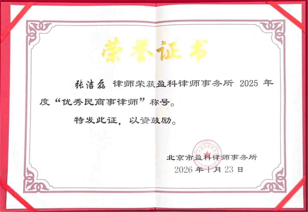 张洁磊荣获盈科律师事务所2025年度“优秀民商事律师”称号。