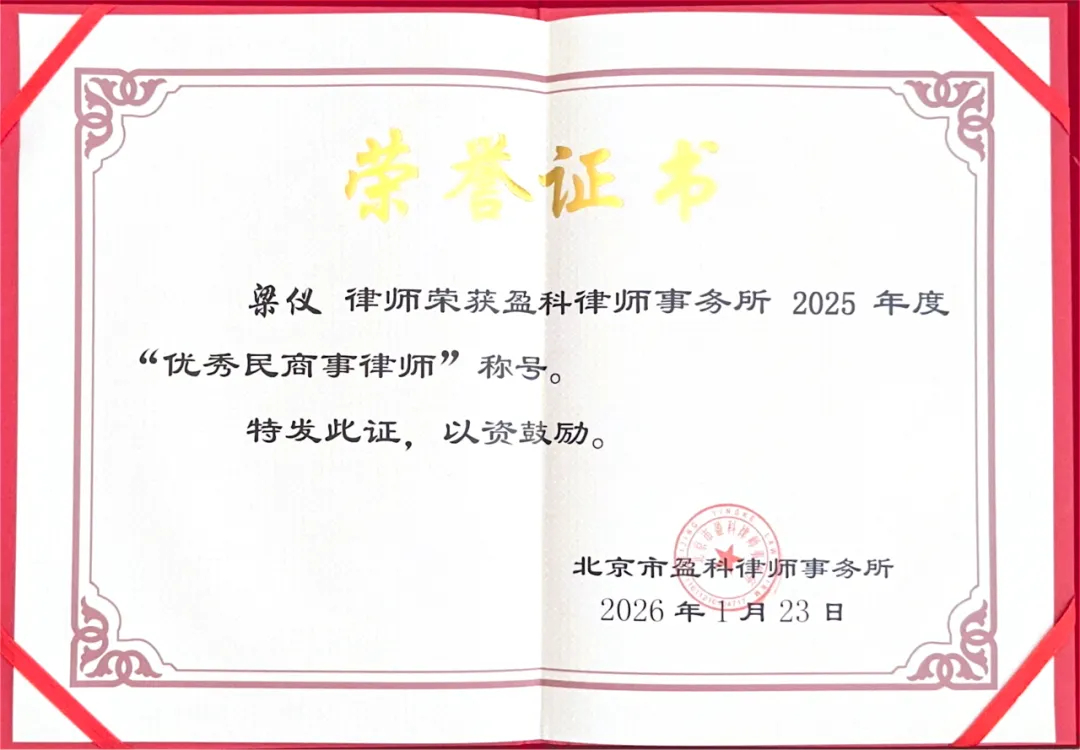 梁仪荣获盈科律师事务所2025年度“优秀民商事律师”称号。
