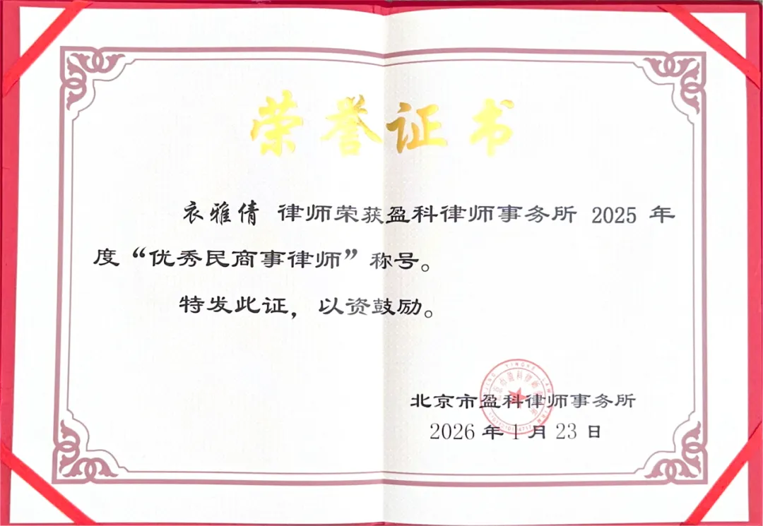 衣雅倩荣获盈科律师事务所2025年度“优秀民商事律师”称号。