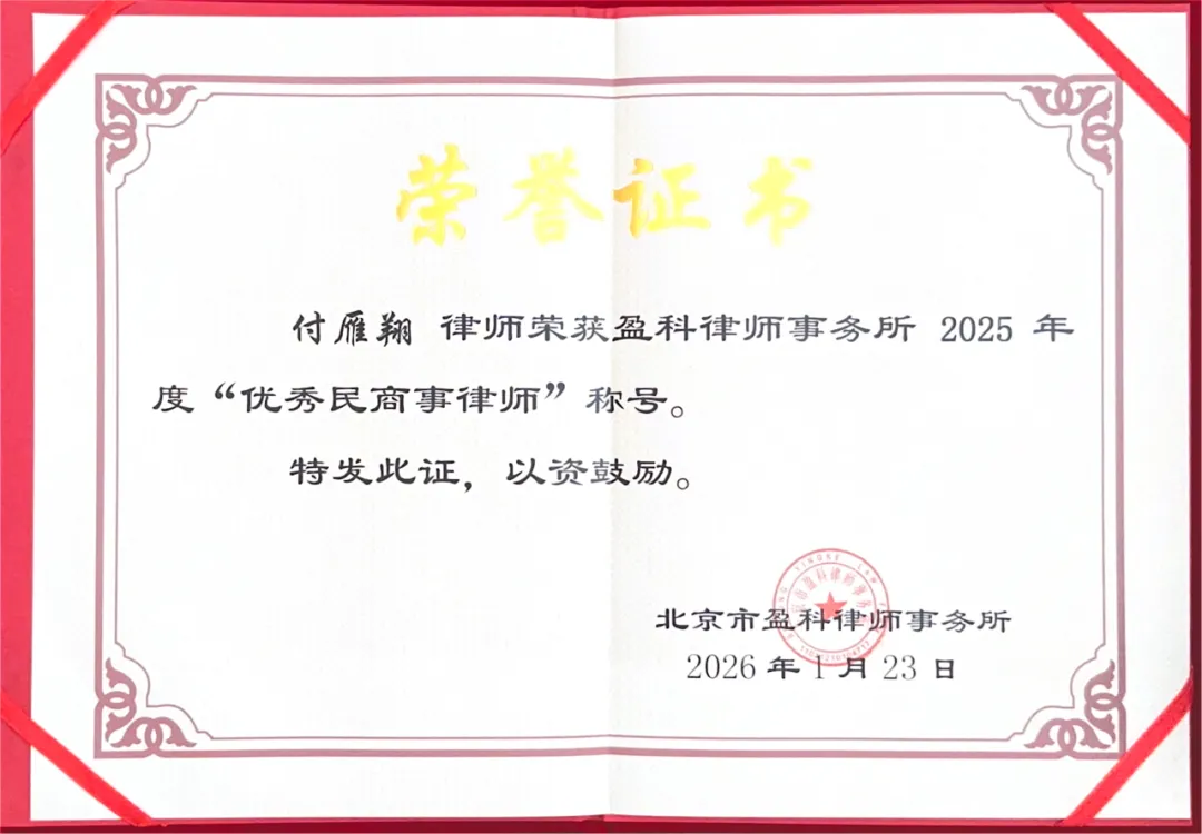 付雁翔荣获盈科律师事务所2025年度“优秀民商事律师”称号。