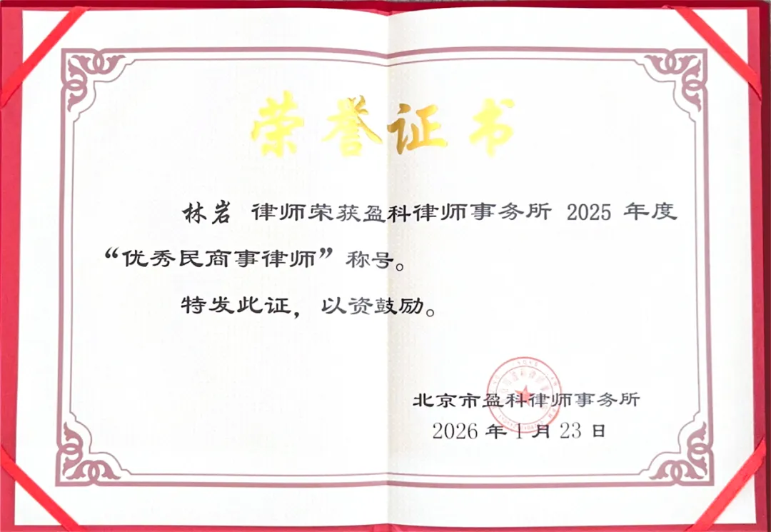 林岩荣获盈科律师事务所2025年度“优秀民商事律师”称号。