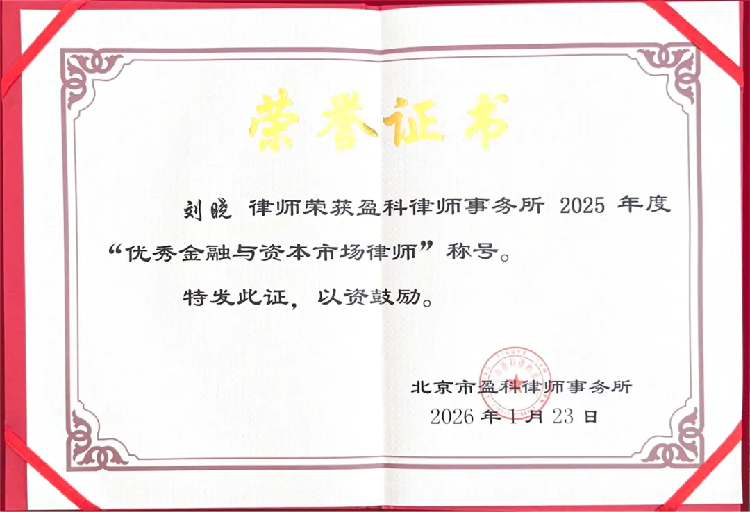 刘晓荣获盈科律师事务所2025年度“优秀金融与资本市场律师”称号。
