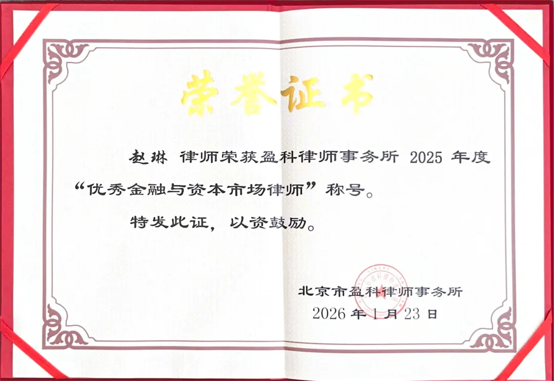 赵琳荣获盈科律师事务所2025年度“优秀金融与资本市场律师”称号。