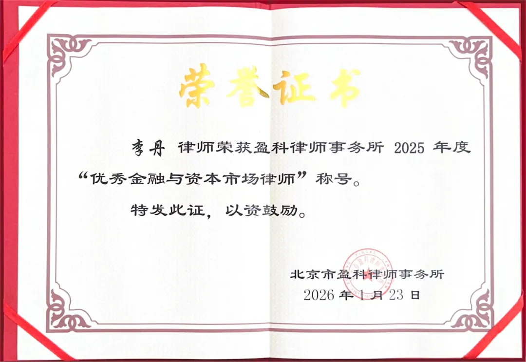 李丹荣获盈科律师事务所2025年度“优秀金融与资本市场律师”称号。