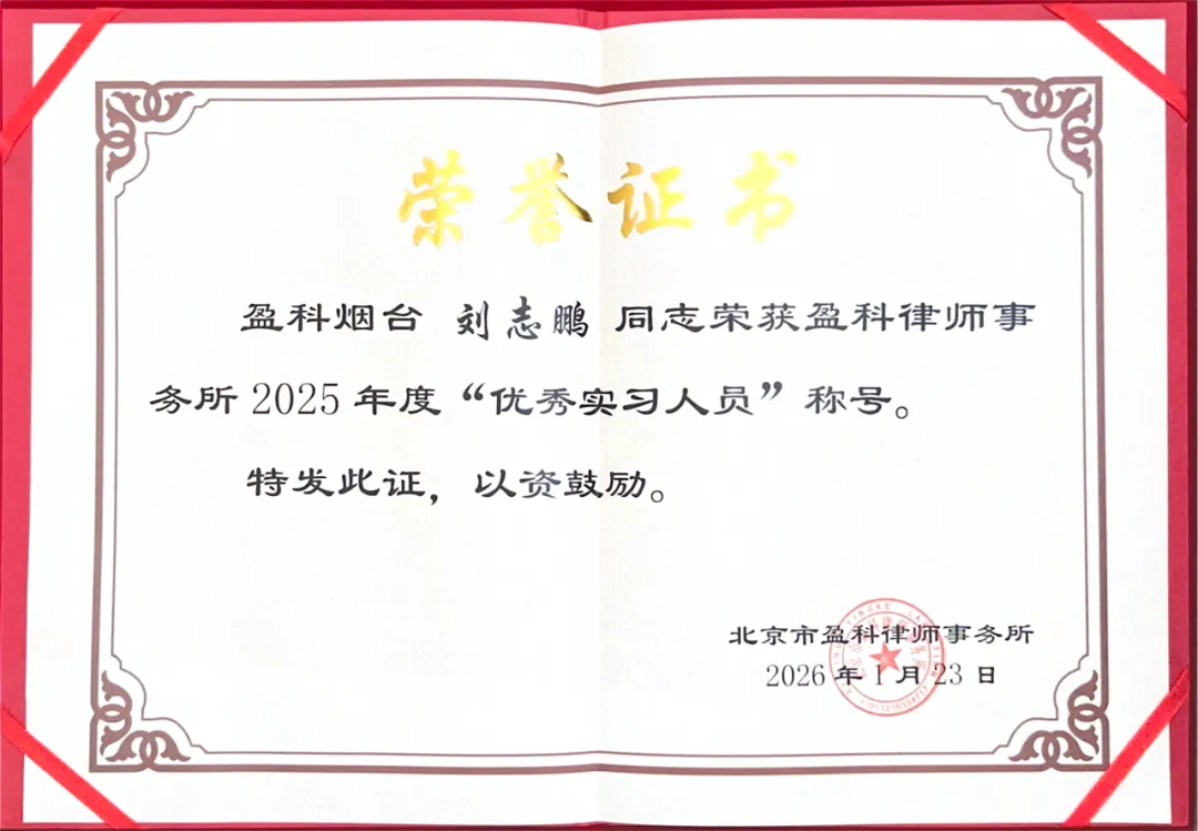 刘志鹏荣获盈科律师事务所2025年度“优秀实习人员”称号。