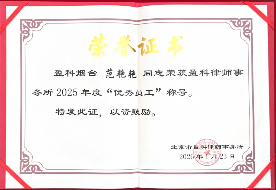 范艳艳荣获盈科律师事务所2025年度“优秀员工”称号。