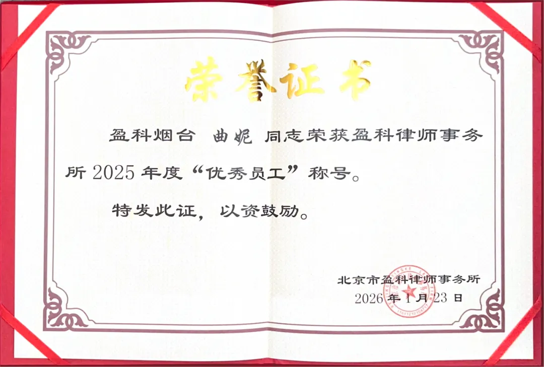 曲妮荣获盈科律师事务所2025年度“优秀员工”称号。