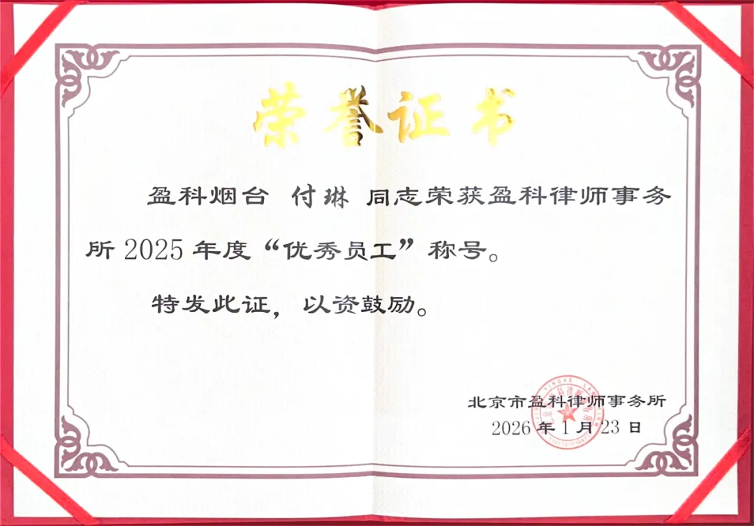 付琳荣获盈科律师事务所2025年度“优秀员工”称号。