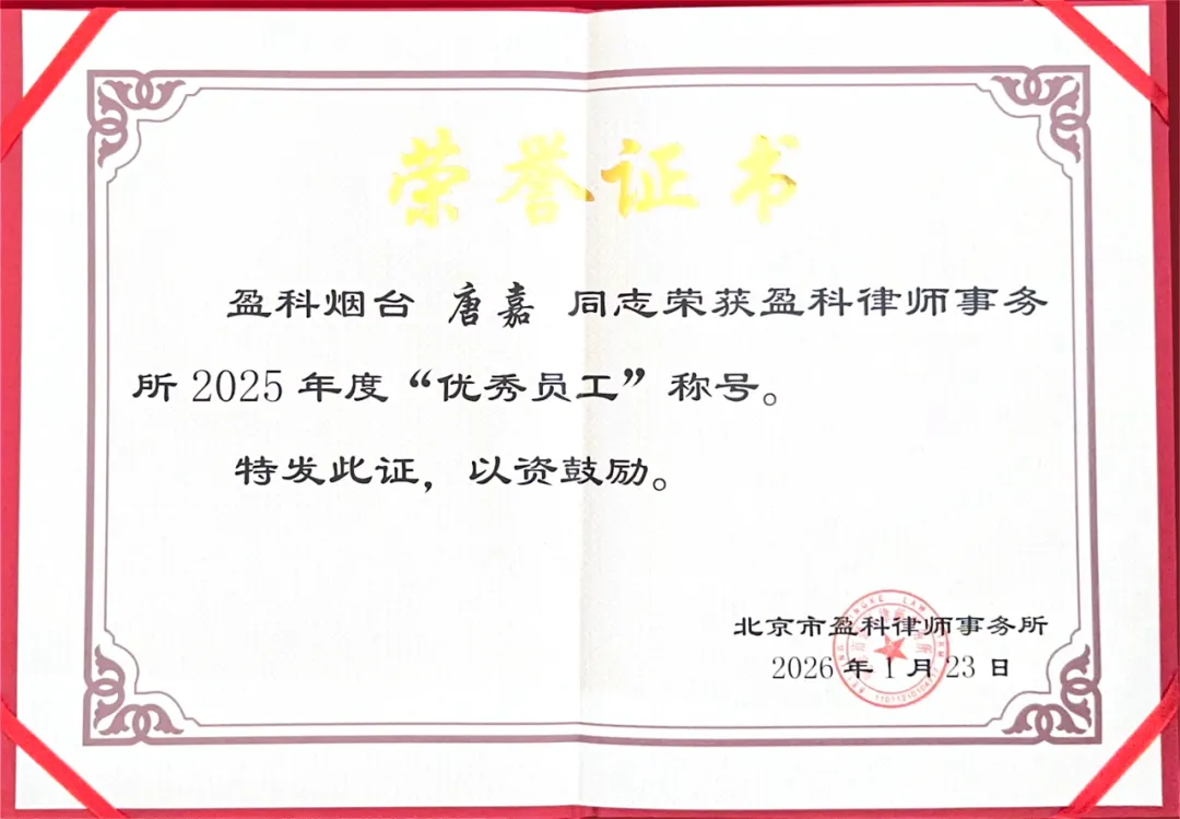 唐嘉荣获盈科律师事务所2025年度“优秀员工”称号。