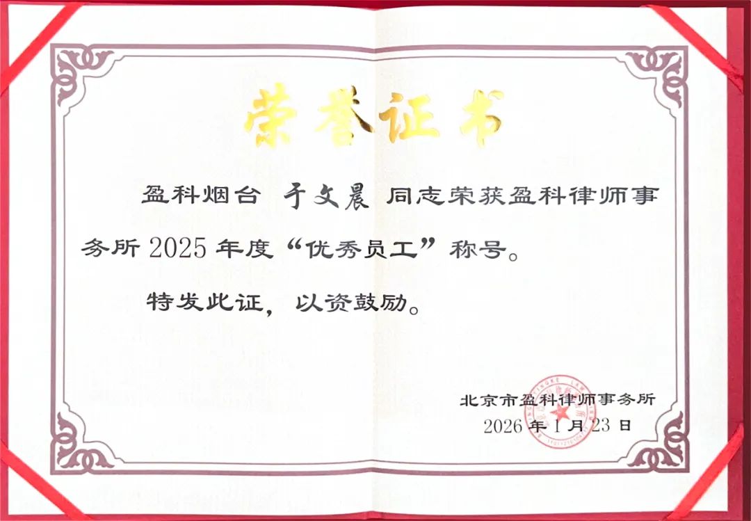 于文晨荣获盈科律师事务所2025年度“优秀员工”称号。