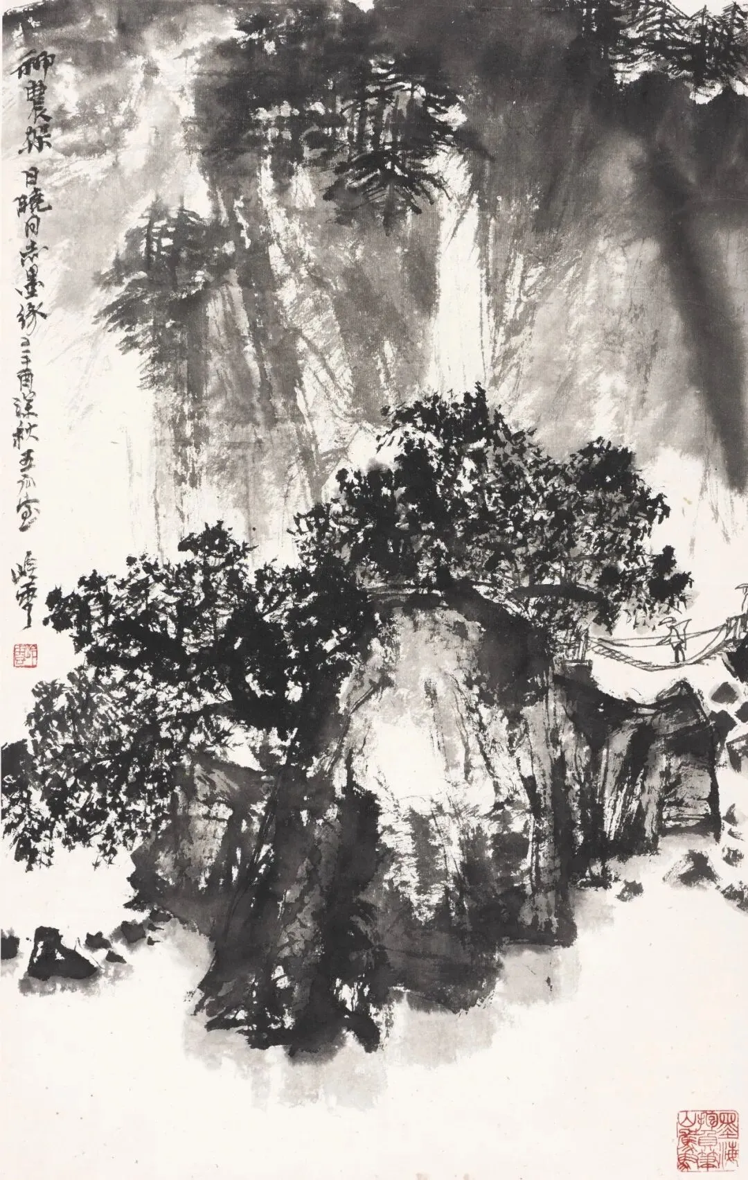 “精微”与“广大”从来不是对立的两极,而是中国画艺术相辅相成的辩证法。没有广大的视野,笔墨精微便会沦为琐碎的炫技;缺乏精微的笔墨支撑,广大格局则成空洞的口号。钱松喦《春山图》以笔墨勾勒山河壮阔间用青绿着色点染灵动飘逸,陆俨少《江边松石》借皴擦点染彰显自然灵韵,何海霞《松山图》用浓淡墨色铺展云海苍茫,皆在尺幅间承载对天地自然的敬畏与礼赞。尺幅小品里也有对格局的追求,齐秉正《蜻蜓莲蓬》以中锋用笔细描莲蓬叶脉,每一根线条都蕴含力道与韵律;郑乃珖《牡丹》用淡墨渲染花瓣层次,体现“墨分五色”的韵味;方工《猫》的毛发勾勒纤毫毕现,眼神刻画灵动传神。这种“大处着眼、小处着手”的创作态度,尽显对细节的极致追求。