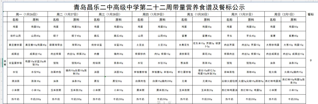 青岛昌乐二中高级中学第二十二周带量营养食谱及餐标公示