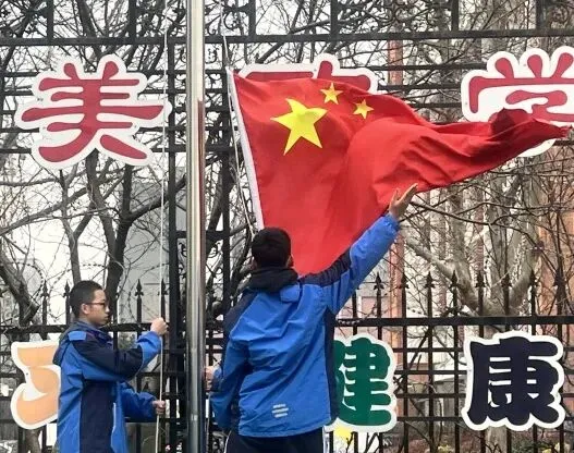 在全体师生的注目下,鲜艳的五星红旗随着雄壮的国歌冉冉升起。同学们整齐肃立,表达对祖国的崇高敬意。