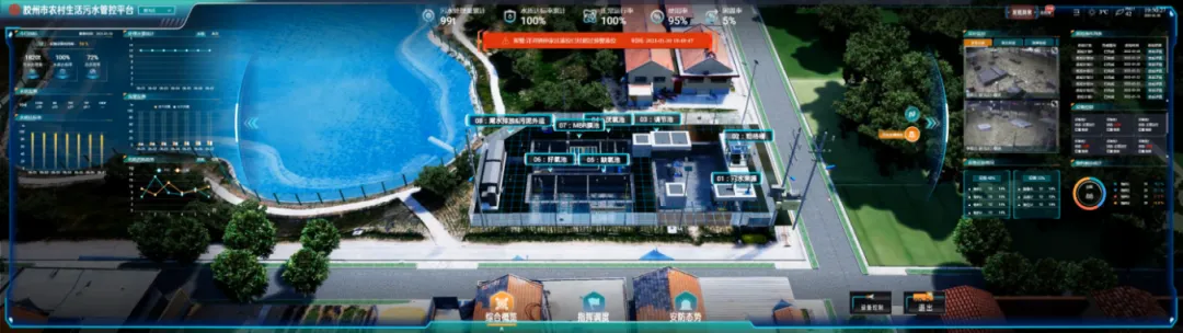 以CIM引擎作为时空基础底座实现数字孪生,承载胶州市农村生活污水治理全部静态、动态数据,提供综合概览、智能指挥调度、安防态势研判、数字化管理、智能化控制等,以业务需求为导向,实现监测、控制、管理、决策的智慧化。