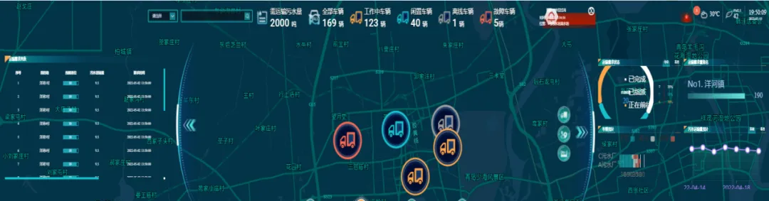 (2)智能指挥调度:根据集水池实时液位、对应村庄道路信息以及当前污水车辆情况,实现污水车作业任务的智能分配和作业路线的智能调度,同时提供污水车量实时位置定位、实时工作状态监测、实时运行轨迹跟踪。