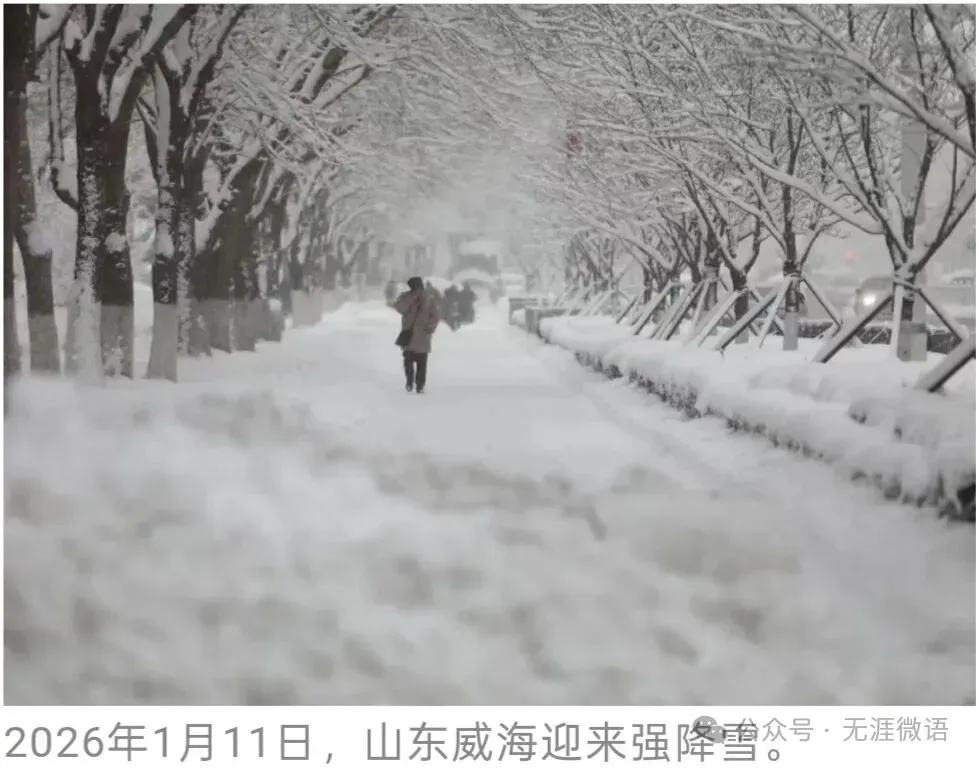 材料二 2026年1月10—11日,威海、烟台局地降下大到暴雪,部分区域出现“雪烟缭绕”的景观。