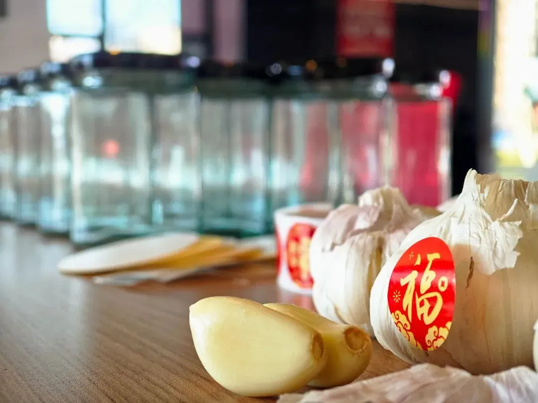 Another custom is making Laba garlic. Garlic is soaked in vinegar for more than twenty days starting from Laba festival. Then when the Chinese New Year comes, the garlic and vinegar is used alongside dumplings on the table.