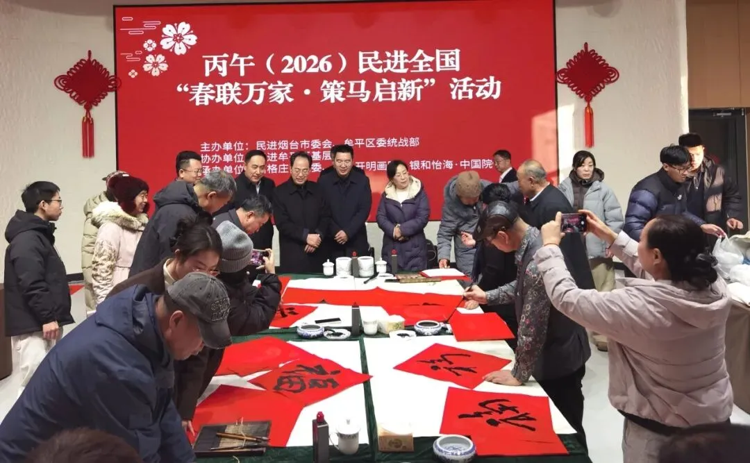 年味渐浓,暖意融融。在丙午马年春节即将来临之际,为传承中华优秀传统文化,传递民进组织的关怀与温暖,1月24日,民进烟台市委会赴牟平区莒格庄镇开展丙午(2026)民进全国“春联万家·策马启新”主题活动,用笔墨寄深情,用慰问暖人心,为当地群众送上满满的新春祝福。市政协副主席、民进烟台市委会主委曲荣君出席活动。牟平区区委常委、区委办公室主任、莒格庄镇党委书记孙伟东,区委常委、统战部部长李杰,民进烟台市委会副主委宋华西、秘书长孙泓炜,牟平区政协副主席、民进牟平区基层委主委侯雁冰陪同活动。
