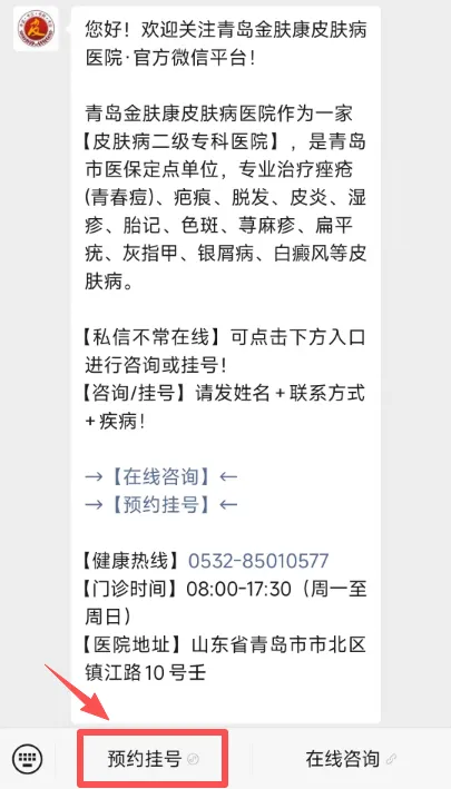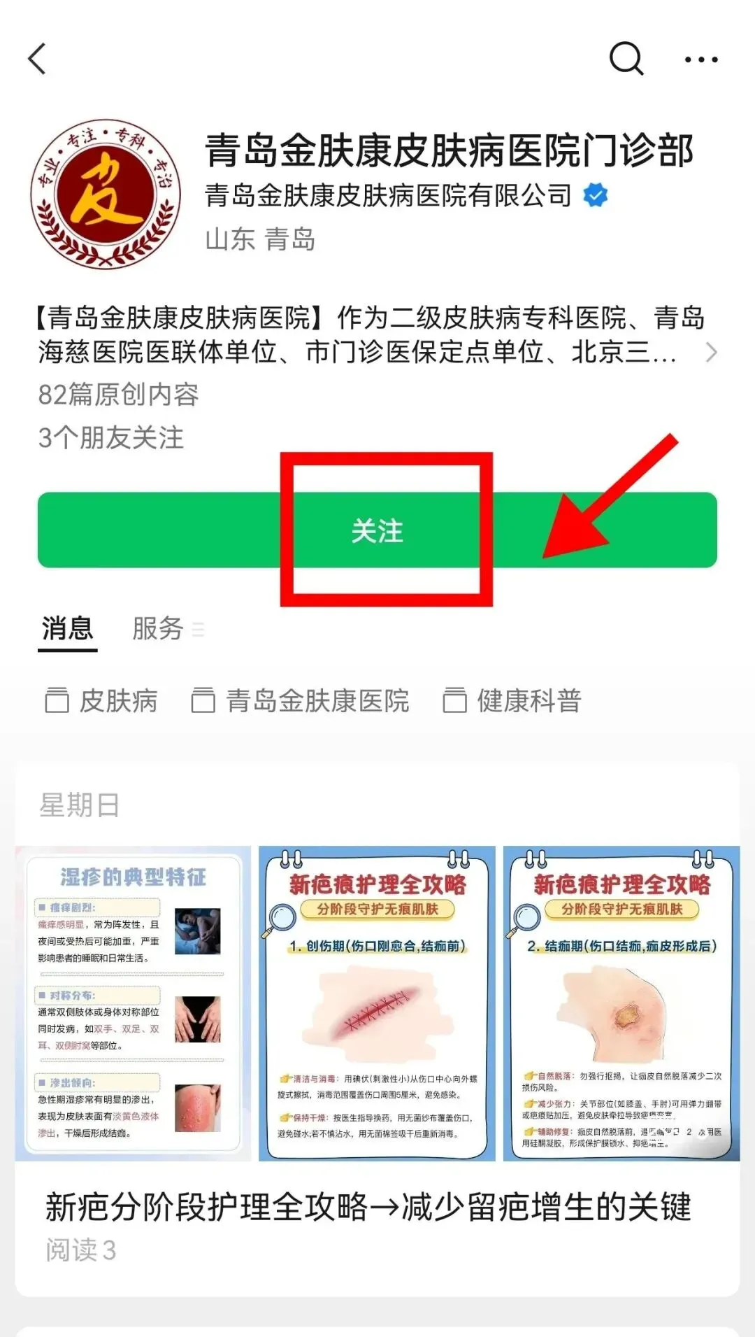 关注青岛金肤康皮肤病医院门诊部公众号↓↓↓