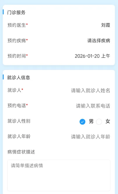 进入挂号页面,按需求选择科室及医生,选择预约时间,确认预约信息。