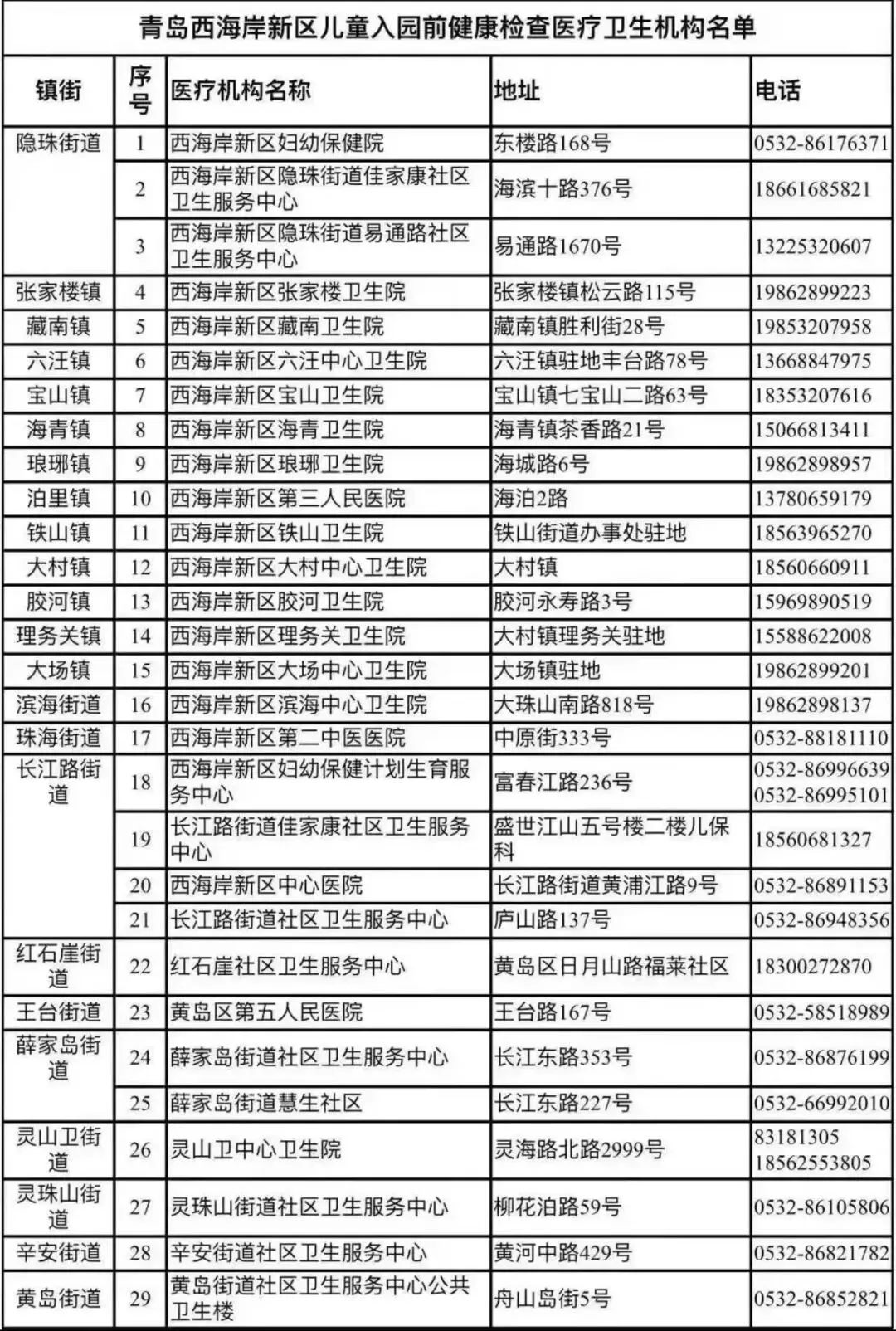 附表1:2026年《青岛西海岸新区儿童入园前健康检查医疗卫生机构名单》