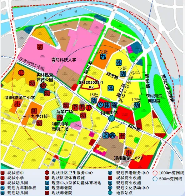 教育与医疗方面,现状周边有青岛科技大学、三十九中市北分校、郑州路第二小学、洛阳路第二小学、现状幼儿园6处、社区卫生服务中心2处,规划周边有九年制学校1处、幼儿园3处;