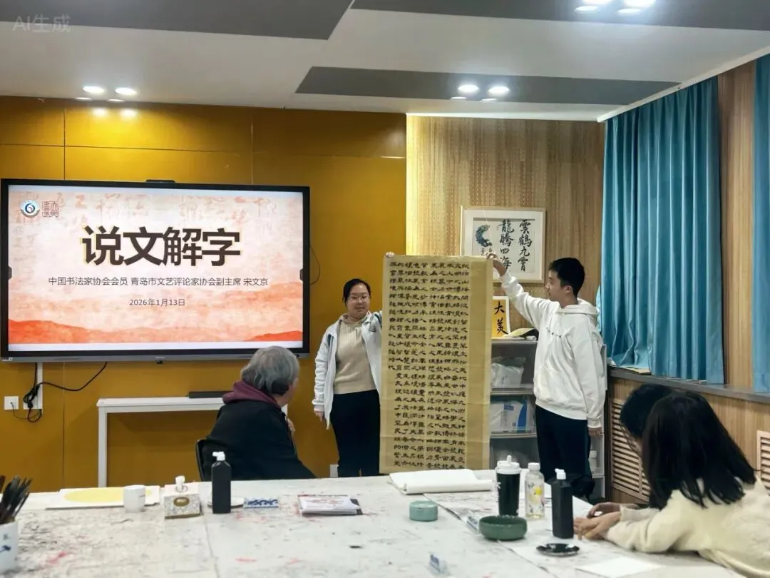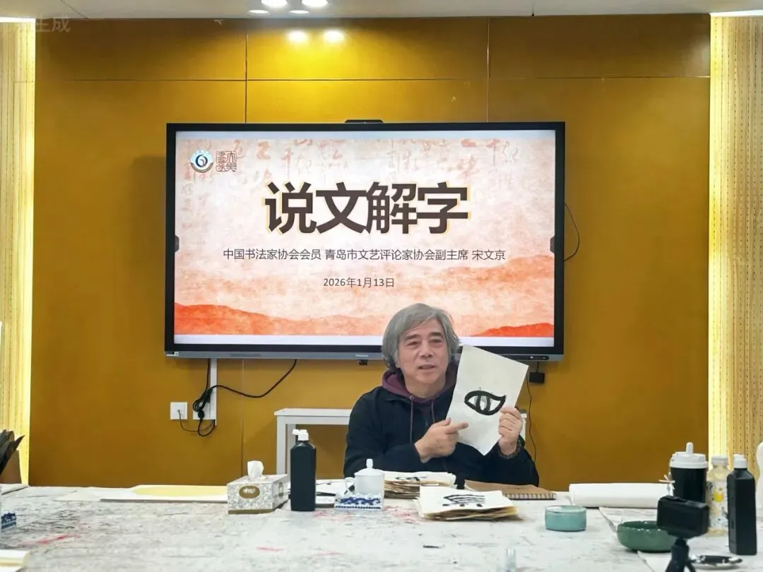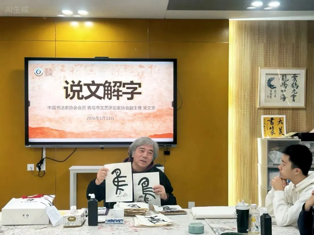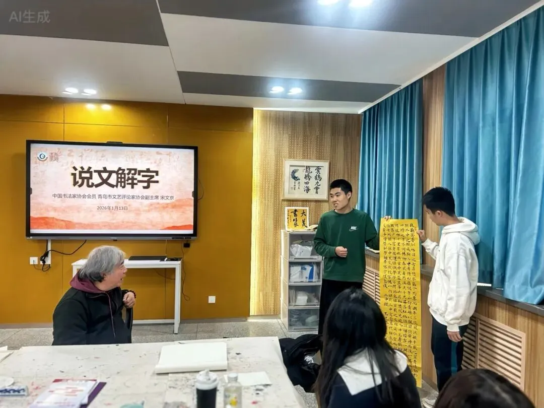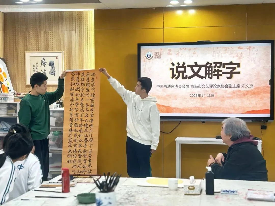 笔墨传文脉,名家启书生。2026年1月13日,青岛二中艺术社团“大美书篆”社邀请青岛画院专职书法家、艺术评论家、文化学者宋文京老师莅临校本课程的课堂,开展以“说文解字”为主题的文化讲座。